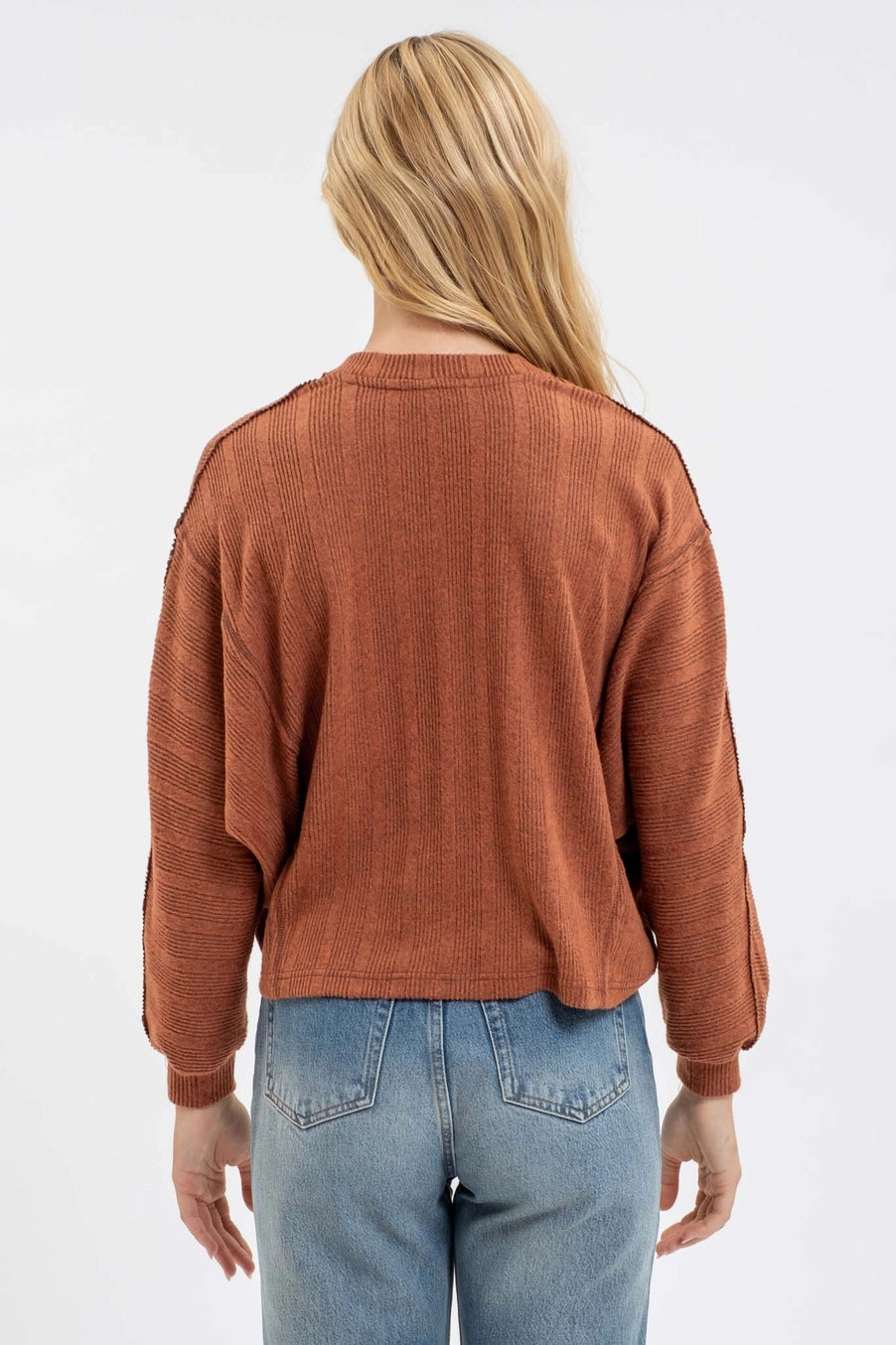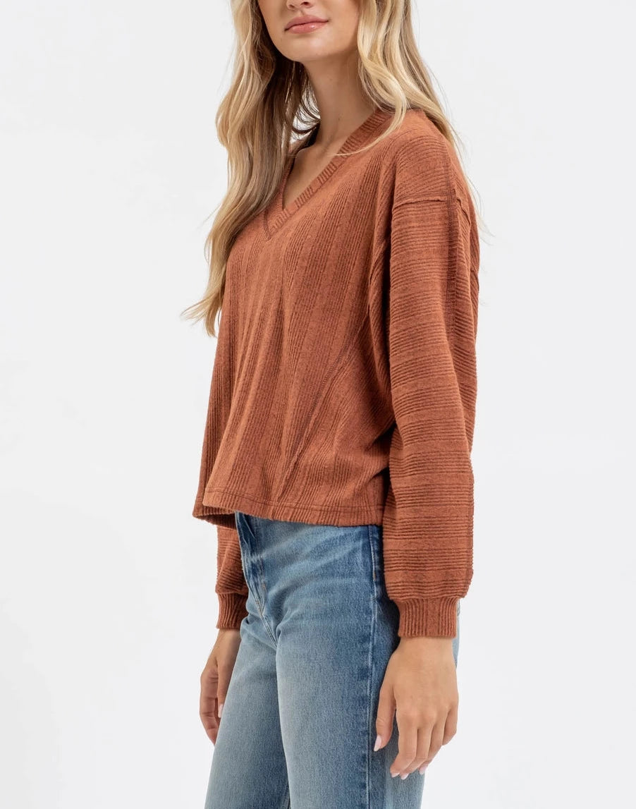 The Calabaza knit top is designed with a V neckline, long sleeves, and drop shoulder for a relaxed fit. Made with ribbed sweater knit material, it is both soft and solid. Crafted without a lining and with 95% polyester and 5% spandex, it offers a comfortable and stretchy fit.