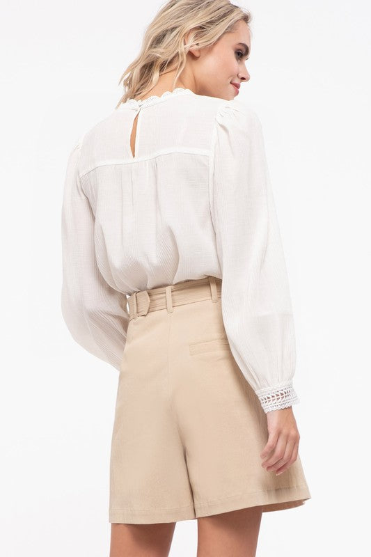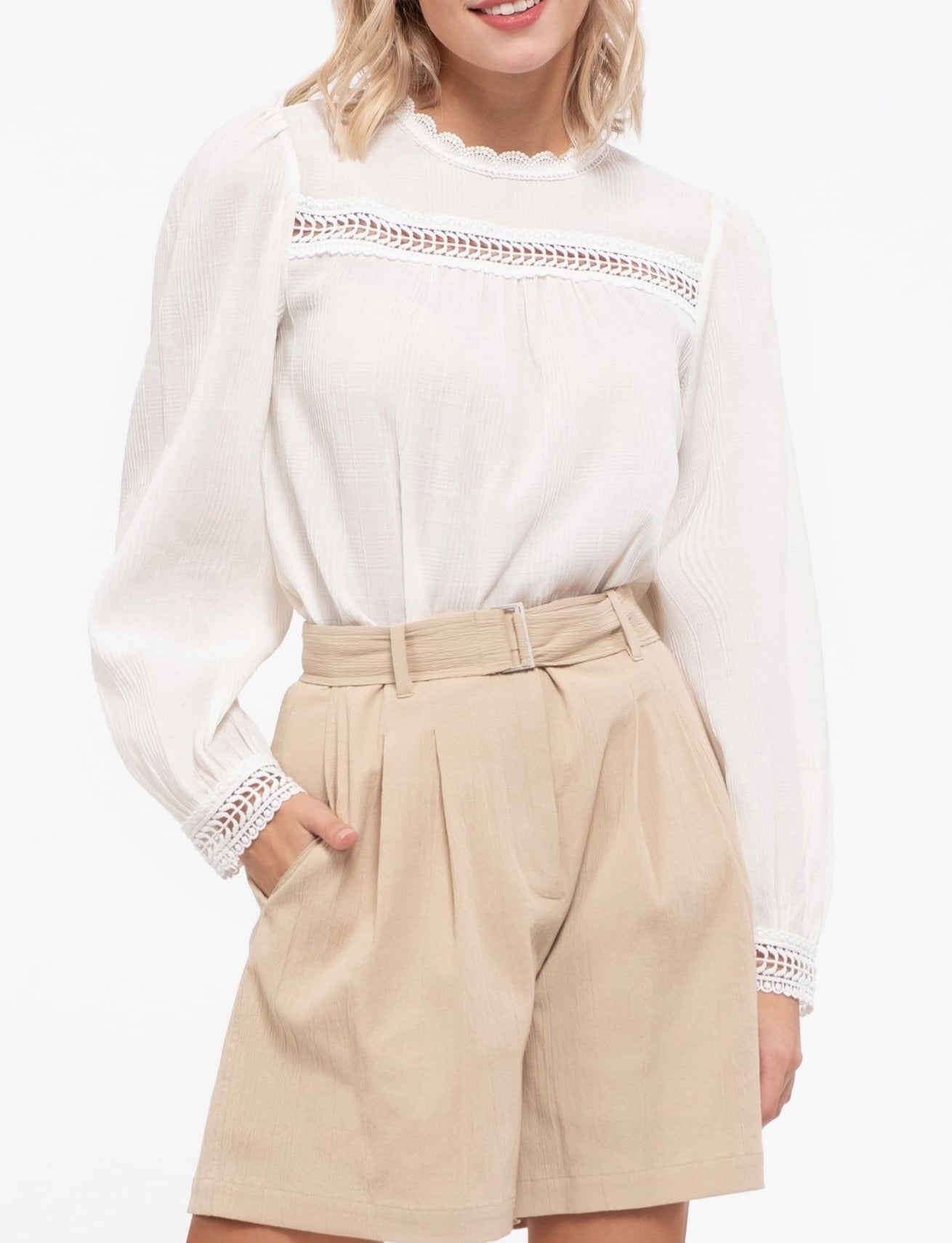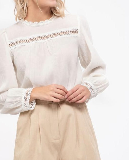 ROUND NECKLINE WITH LACE TRIM - LONG SLEEVES WITH LACE CUFFS - FRONT AND BACK YOKE WITH LACE INSET
