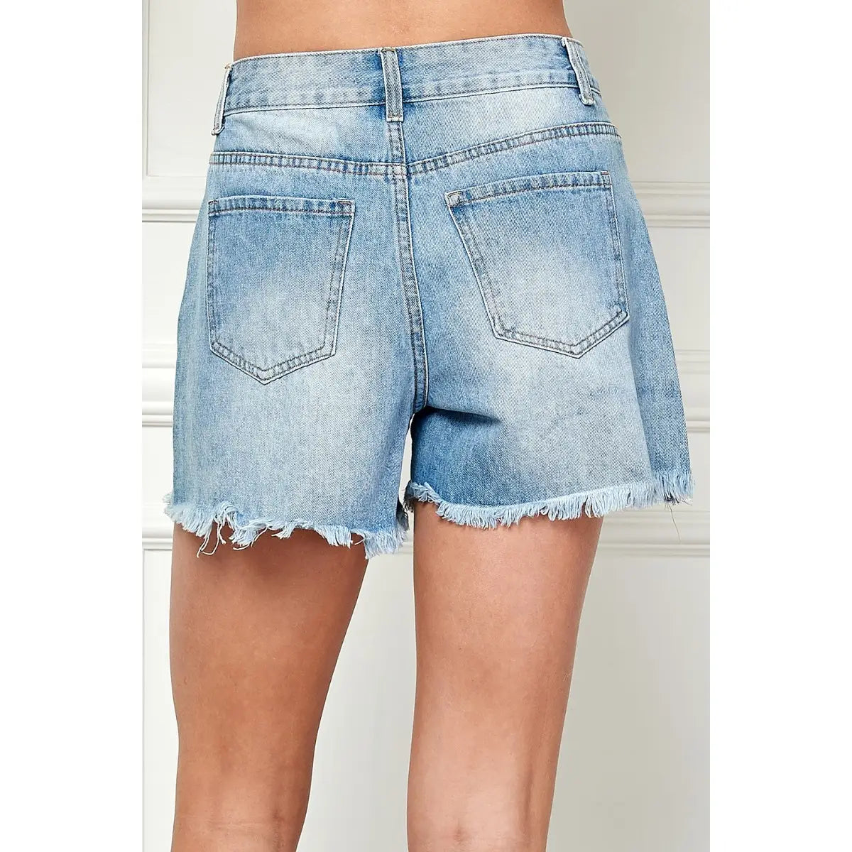The Bibi High Rise Shorts are designed for style and comfort. Their medium-washed denim construction, high-rise waist, and belt loops make them an ideal choice for any wardrobe. The zipper closure and one side coin pocket provide a secure fit and convenience, while the distressed front hem and raw hem back add a unique touch that will make you stand out in a crowd.