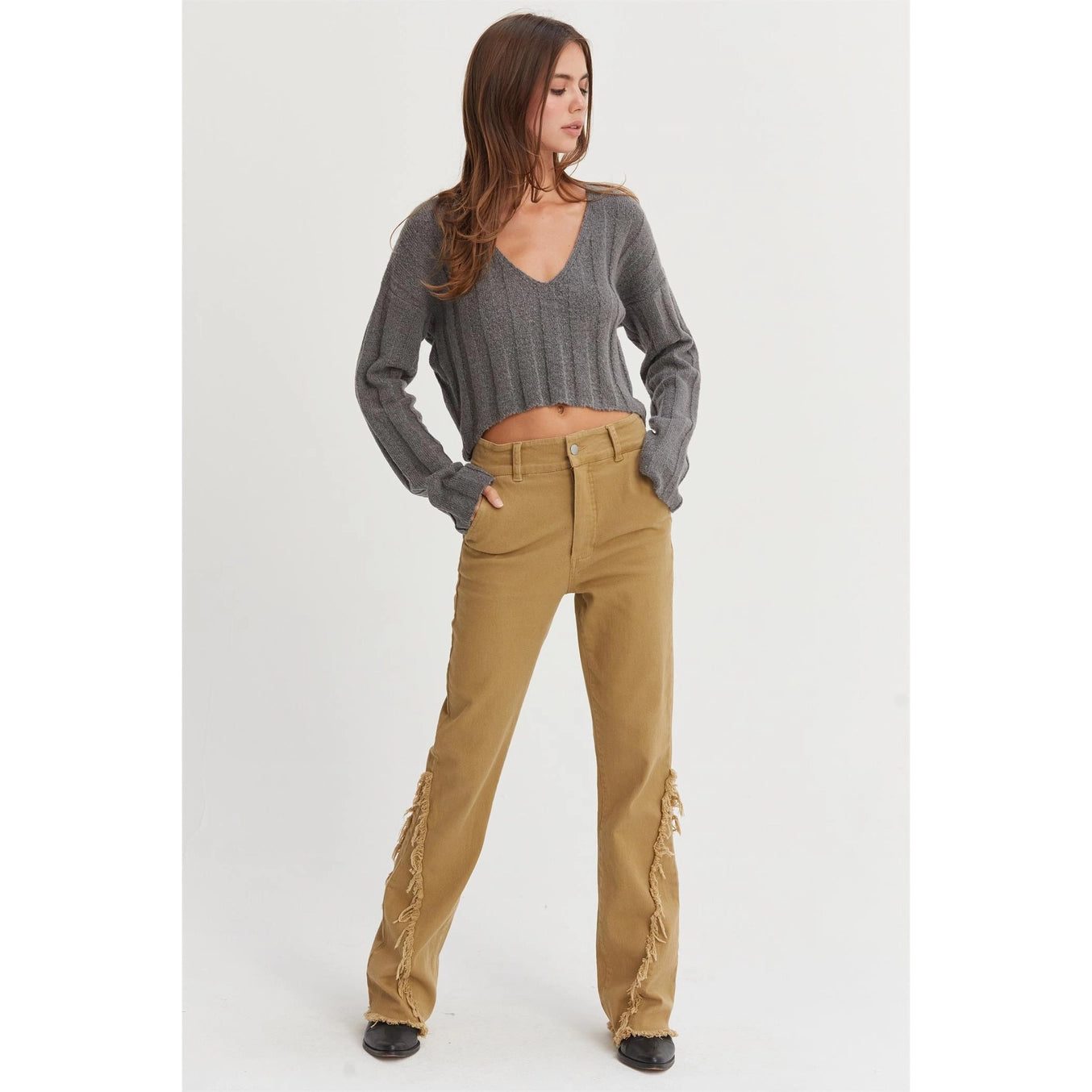 These Washed Twill Pants Are Your New Go-To Pants For Casual Outings. These Are Styled With A High-Rise Waist And Belt Loops For A Comfortable Fit, While The Flare-Leg Silhouette Adorned With Distressed Detailing Creates A Trendy Look.