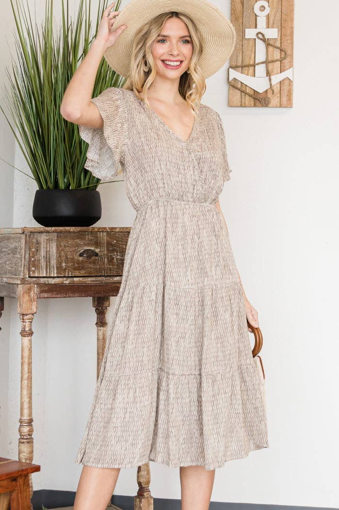 Features elbow-length flutter sleeves, and a V-front.