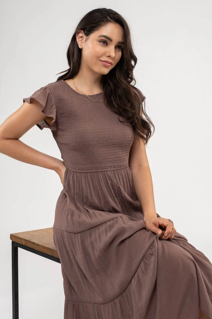 Feel confident and beautiful in the Aitana Tiered Dress! Its round neckline, keyholed back button, smocked body, and tiered skirt create an effortlessly flattering silhouette. Crafted from 62% rayon and 38% polyester, this dress is lined with 100% polyester for maximum comfort. Step out in style with the Aitana dress!