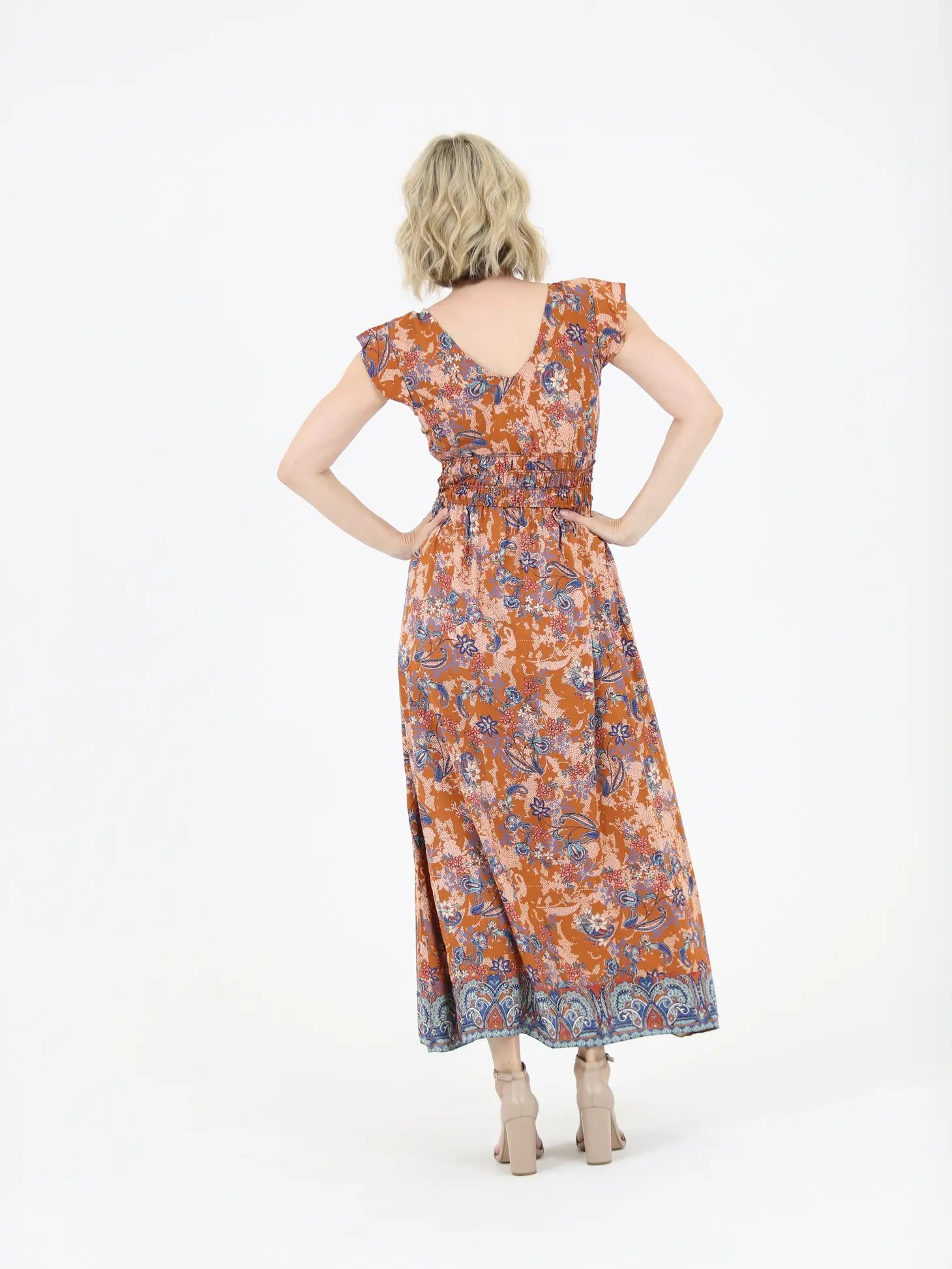 Perfect for your next special occasion, the Mariposa maxi dress features a floral print v-neck maxi with a ruffle sleeve, elastic waist, and front tie.