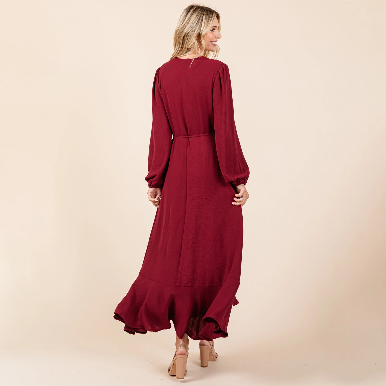 Indulge in elegance with The Rubi Maxi Dress. Featuring a cascading ruffle hem and a flattering tie waist, this V-neck dress is both luxurious and versatile. With elastic cuffs and a lightweight stretchy fabric, it's perfect for wedding guest attire or a statement look for any occasion.