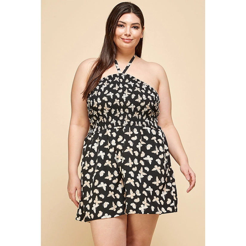 This sleeveless romper features a smocked top and loose-fit shorts. Ties from center front to behind the neck which makes it adjustable and comfortable.
