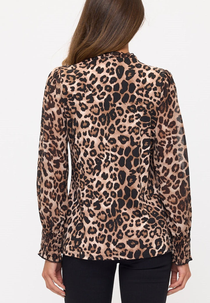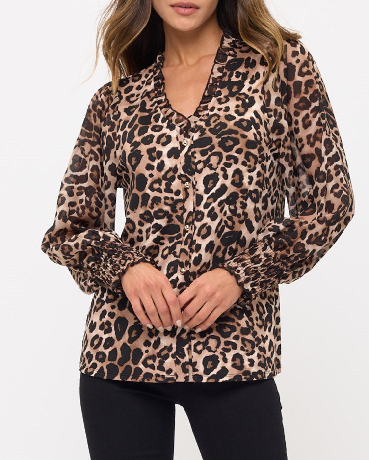 This Animal Print Button Down Shirt combines stylish mixed media design with a sophisticated ruffle V-neckline. Its sheer blouson long sleeves feature smocked cuffs for a refined finish, while the button-down front adds classic detail. Crafted from a comfortable, relaxed-fit blend of 95% polyester and 5% spandex, it offers both stretch and durability, making it a versatile addition to your wardrobe.