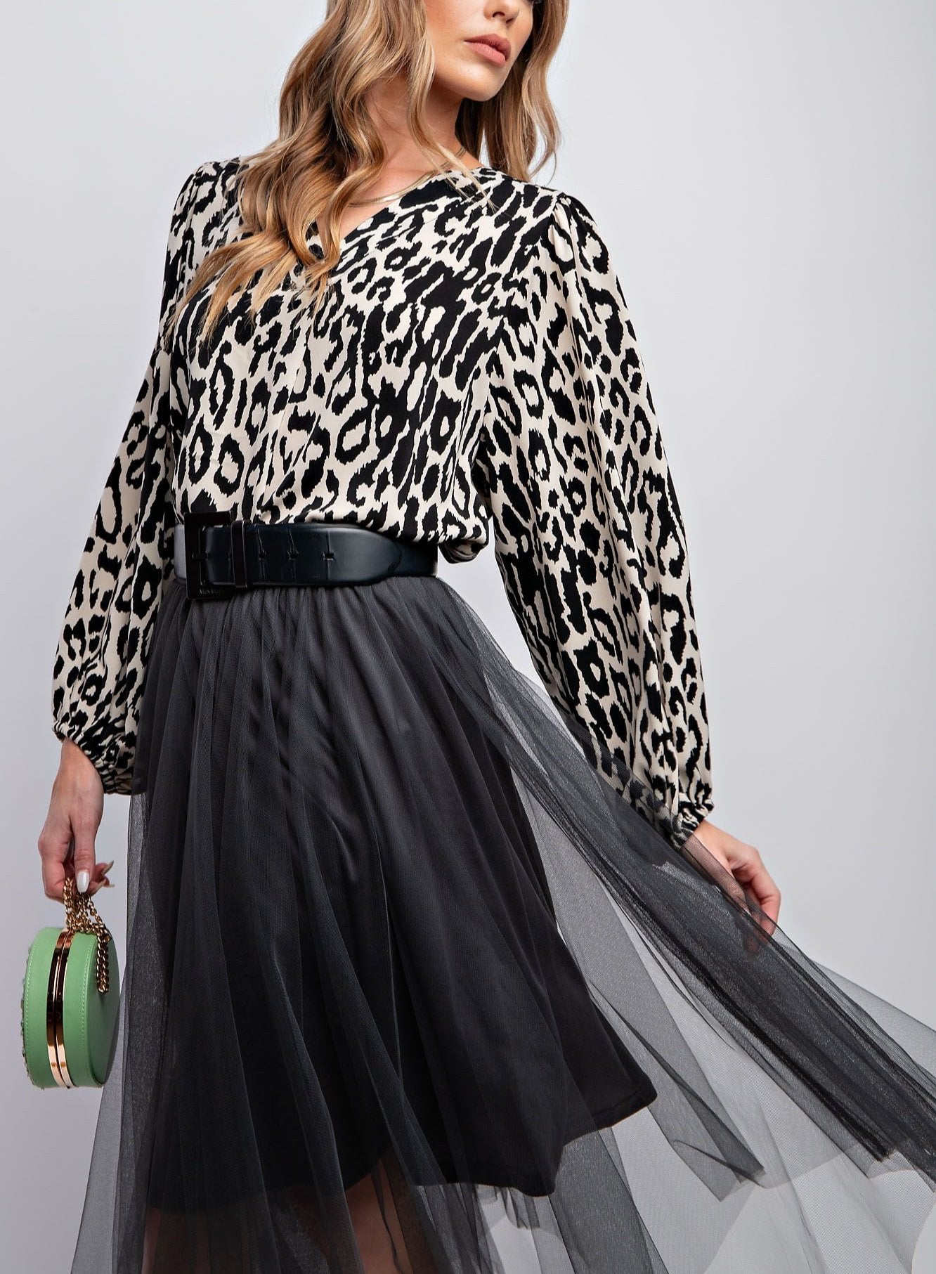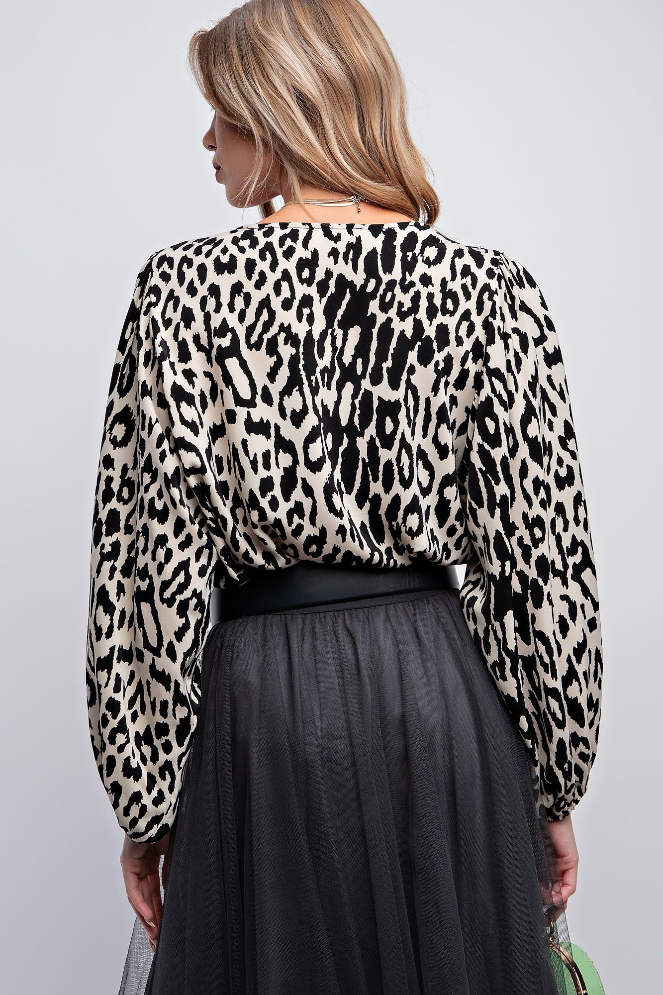 Embrace your wild side with the Leonella Leopard Print Blouse. Its bold leopard print pairs perfectly with its relaxed and loose fit, accentuated by a V neckline and elastic sleeves. This sophisticated pullover style exudes confidence and luxury. Make a statement with every wear