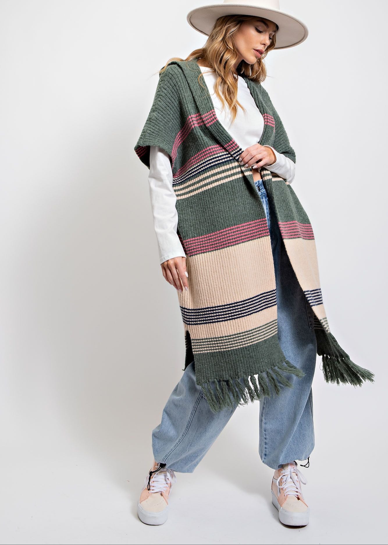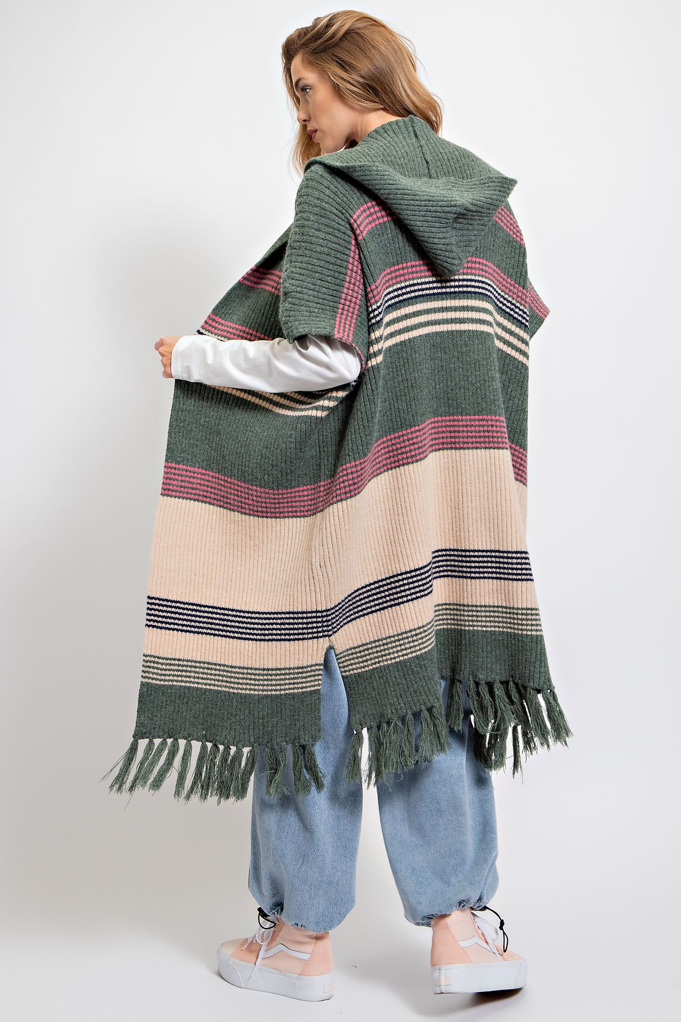 This multicolor knitted sweater kimono is perfect for adding a touch of bohemian style to any outfit. The kimono sleeves and relaxed, loose fit make it comfortable and easy to wear, while the stripe pattern and fringe detailing add visual interest. Plus, the attached hood adds a cozy and functional touch. Made with a blend of acrylic, nylon, poly, and wool, it's warm and durable for all your fun adventures.