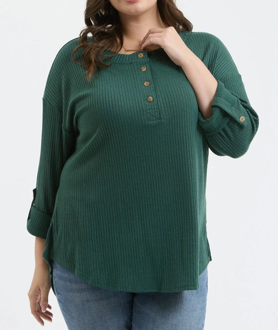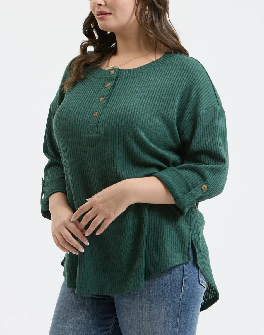 Upgrade your casual wardrobe with our Plus Henley Knit Top. Designed with a Henley neck and half button down, this top features 3/4 tab sleeves and a relaxed fit. The ribbed texture adds a touch of style, while the lightweight fabric keeps you comfortable. Perfect for any occasion!