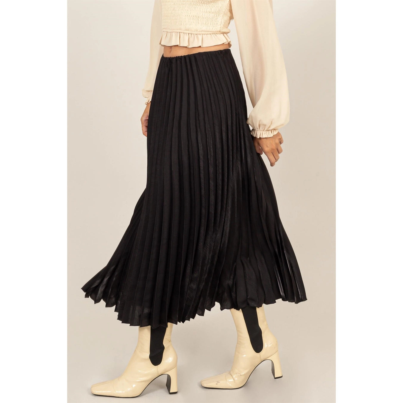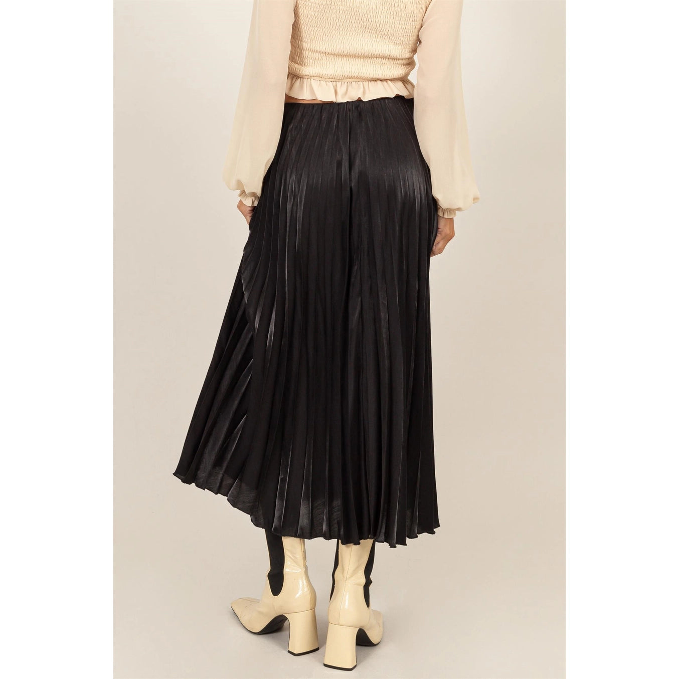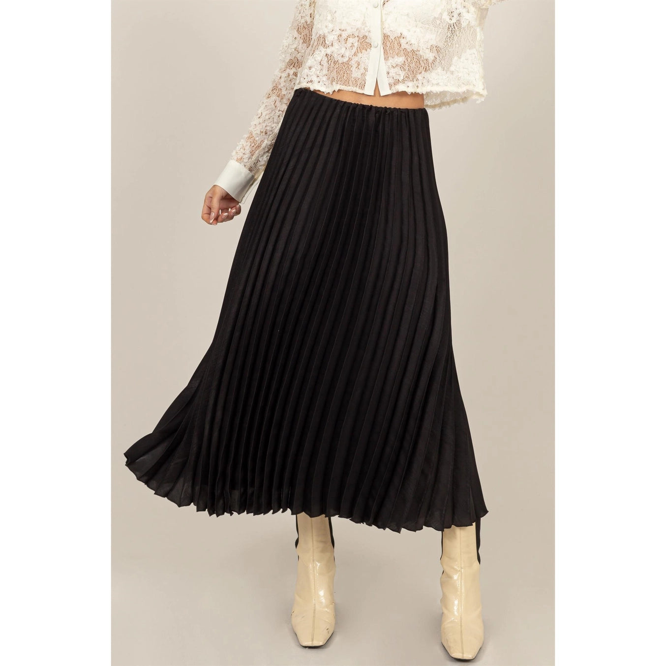 Embrace elegance in The Chayanne Pleated Skirt. This midi skirt features a classic, fluid pleat design that adds sophistication to any outfit. Perfect for any occasion, its versatile style makes it a must-have for your wardrobe. Pair with a lace top for a chic look or a simple blouse for a more understated vibe.