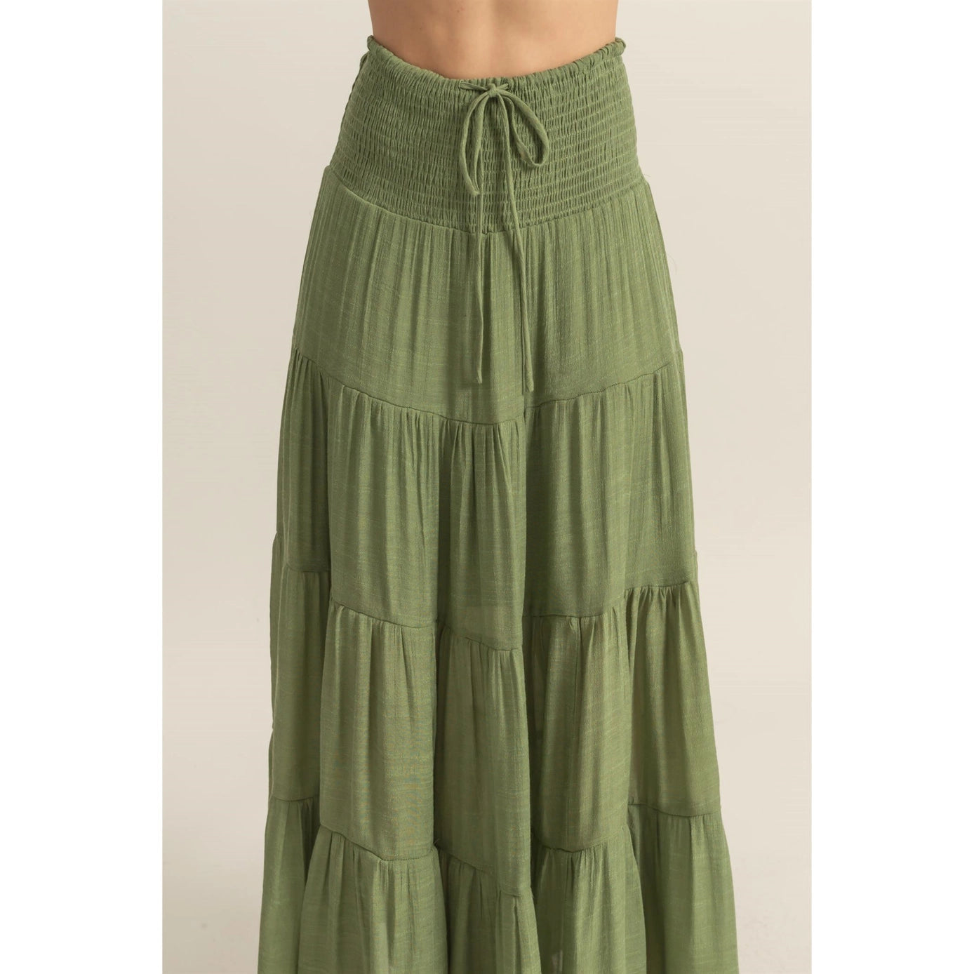 Get ready to charm everyone with your feminine looks in the Olinda Maxi Skirt! This flowy skirt is cut into a gathered style with tiered detailing, adding a touch of romance to your outfit. The ankle-skimming hem and elastic high waist with a drawstring make it comfortable and stylish. Made with 100% polyester.